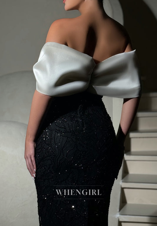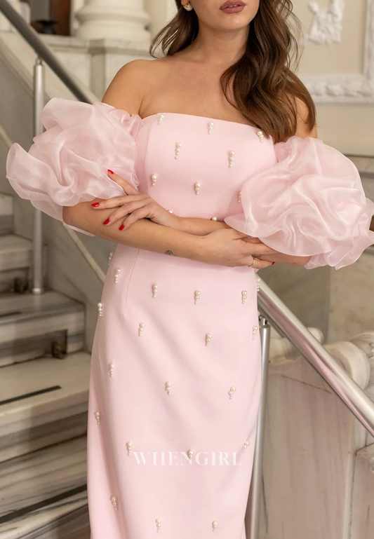 Sheath Off Shoulder Short Puff Sleeves Beaded Pearls Long Evening Formal Dress