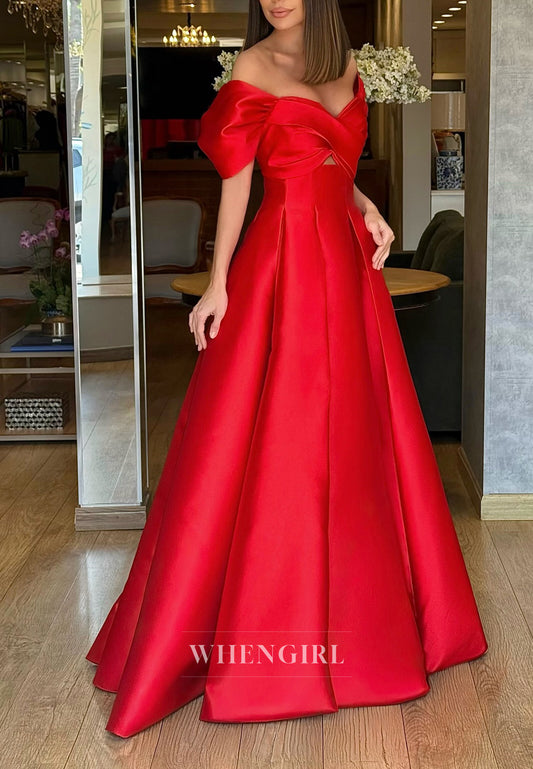 Red A-Line Pleated Short Sleeves Sweetheart Evening Dress Cut Out Satin Formal Gown