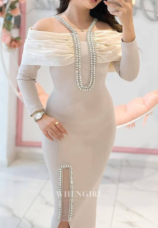 Khaki Rhinestones Beading Straps Long Sleeves Pleated Sheath Side Slit Formal Gown