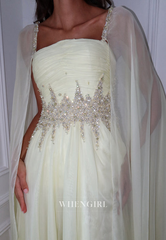 Champagne Rhinestones Beading V Neck Sleeveless Side Slit Sheath Formal Evening Gown with Cape