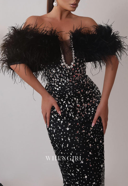 Off Shoulder Black Feather Rhinestone Beaded Sheath Long Formal Evening Dress