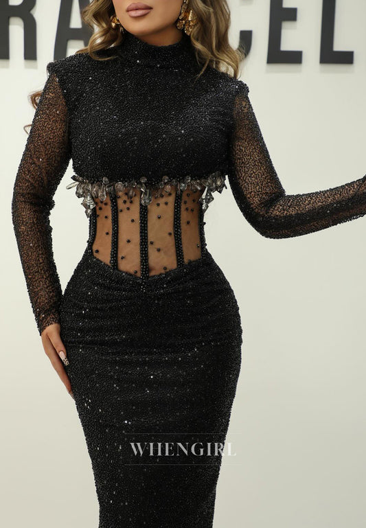 Black Long Sleeves Rhinestones Beading Sheath High Neck Formal Evening Gown