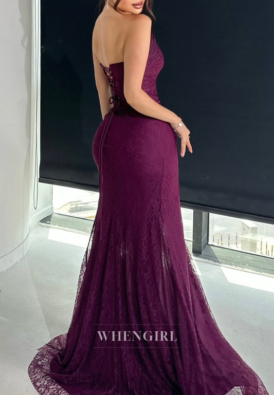 Grape Strapless Lace Up Sleeveless Pleated Side Slit Sheath Formal Evening Dress