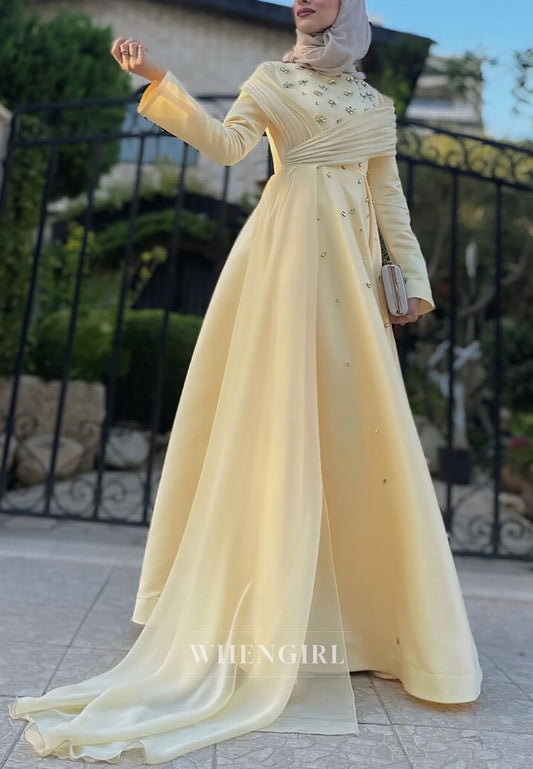 Daffodil Long Sleeves Ruched Side Train Rhinestones Beading High Neck A-Line Formal Evening Dress