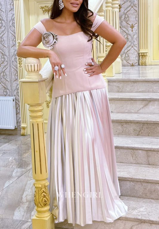 Pink Off Shoulder Sleeveless 3D Flower Pleated A-Line Evening Formal Dress