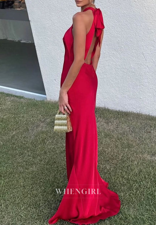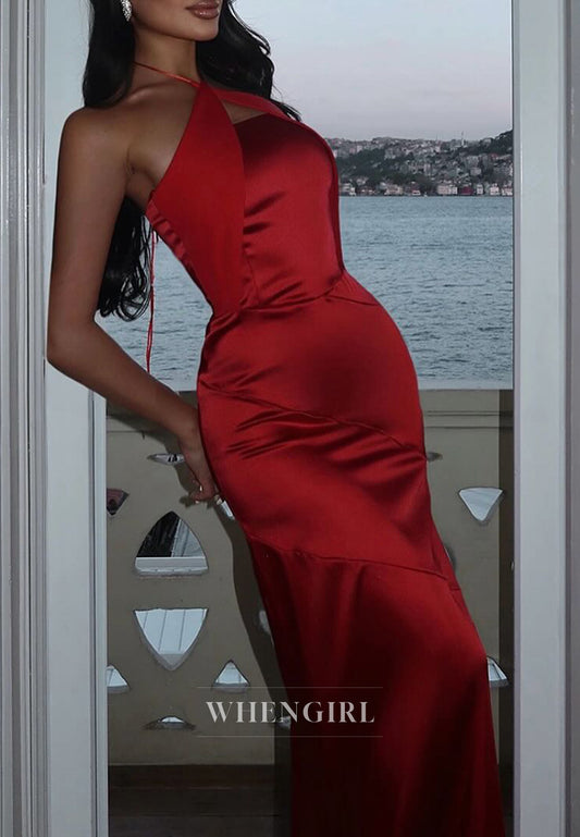 Red Halter Cut Out Back Sleeveless Sheath Floor Length Formal Evening Dress