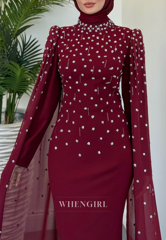 Burgundy High Neck Long Sleeves Beaded Sheath Formal Evening Dress