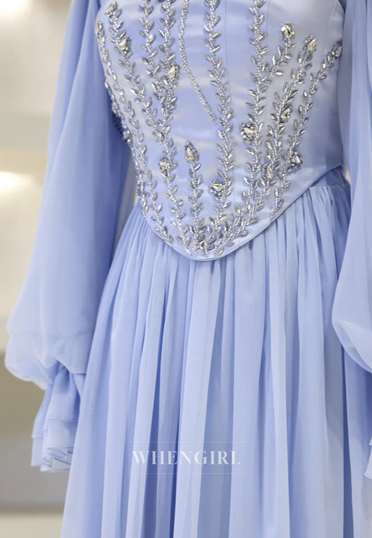High Neck Long Sleeved Pleated Beaded Floor Length A-Line Chiffon Formal Evening Dress
