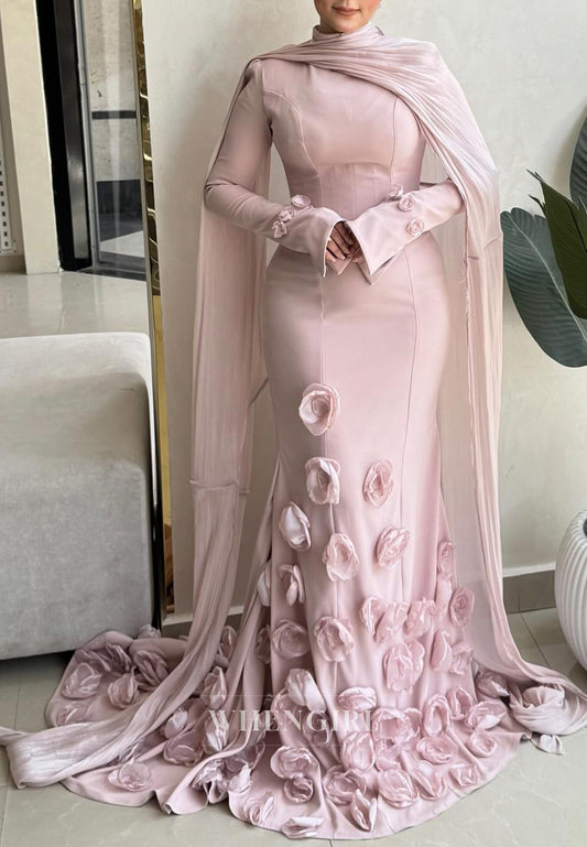 Light Pink High Neck Long Sleeves Floral Mermaid Sweep Train Evening Dress with Cape