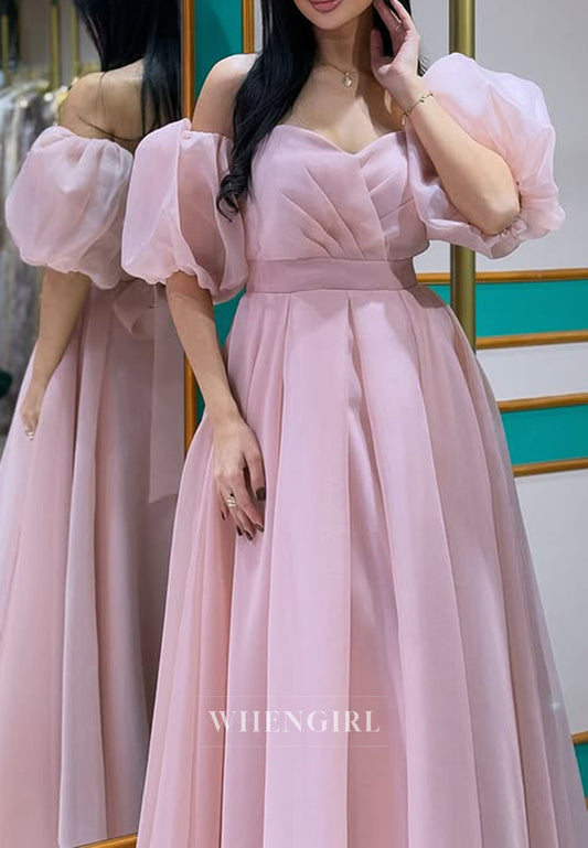 Pale Blush Pleated Sweetheart Short Puff Sleeves Floor Length A-Line Formal Evening Gown