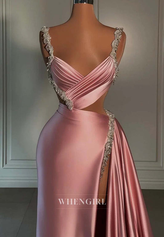 Dusty Pink Beaded Straps Sleeveless Evening Gown Pleated V Neck Sheath Side Slit Formal Dress