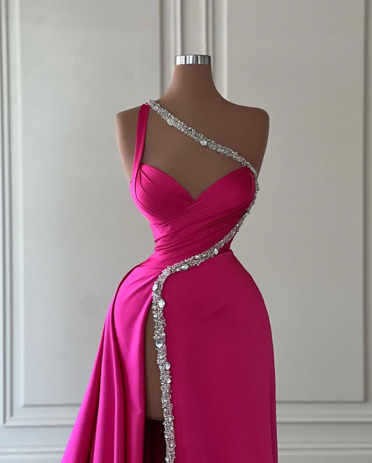 Vintage One Shoulder A-Line Sleeveless Pleats Satin Gala Dress Party Dress with Beaded