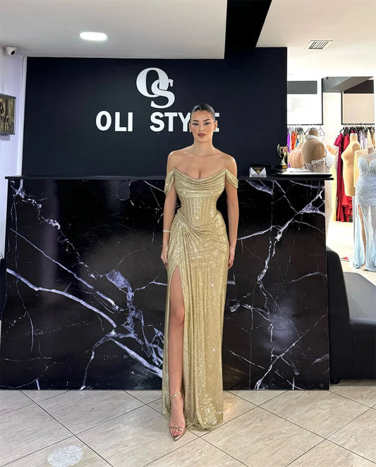 Off Shoulder Glitter Prom Dress Pleated Side High Split Floor-length Formal Evening 2025