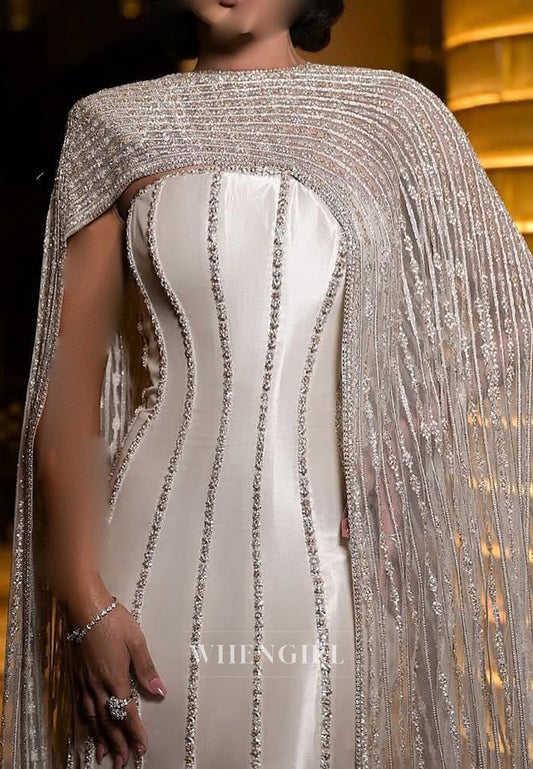 Beige Beaded Bateau Neck Mermaid Formal Evening Dress with Cape