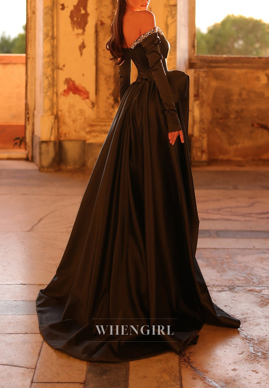 Column Off Shoulder Long Sleeves Beaded Lace Formal Evening Gown with Side Slit