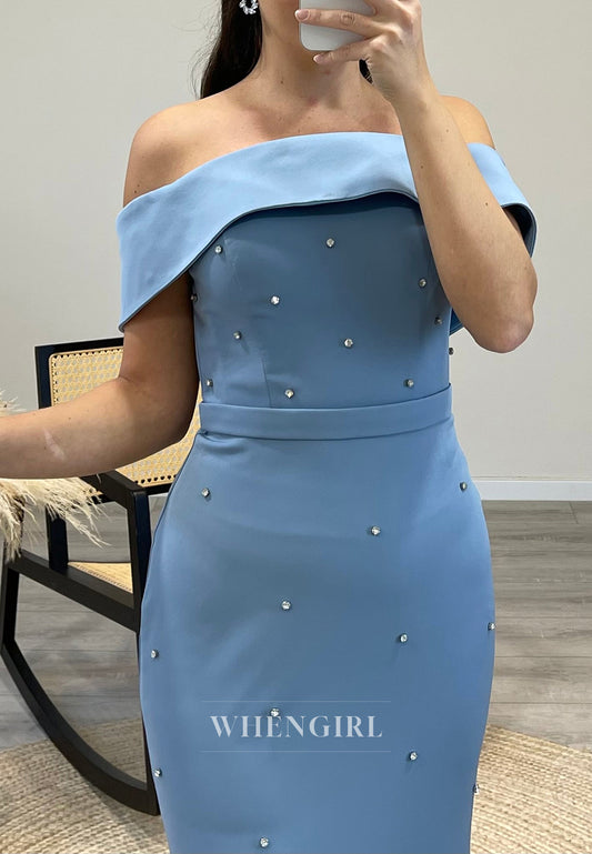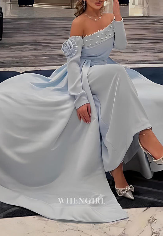 Sheath Light Blue Long Sleeves Side Train Off Shoulder Rhinestones Satin Evening Formal Dress with 3D Rose