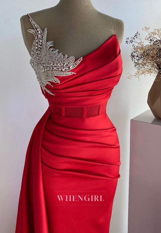 Sweetheart Sheath Evening Dress Sleeveless High Split Pleats Beaded Prom Dress with Train