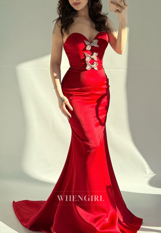 Red Sweetheart Strapless Mermaid Formal Evening Gown with Bowknot and Sweep Train
