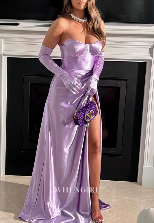 Tahiti Strapless Formal Dress Side Slit Pleated Long Evening Dress with Velvet Gloves