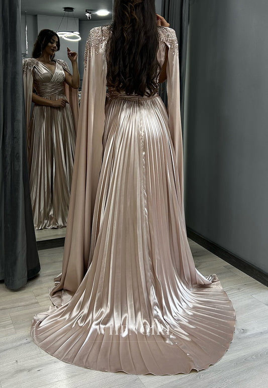 Champagne V Neck Beaded Sweep Train Pleated Back Zipper A-Line Evening Formal Dress