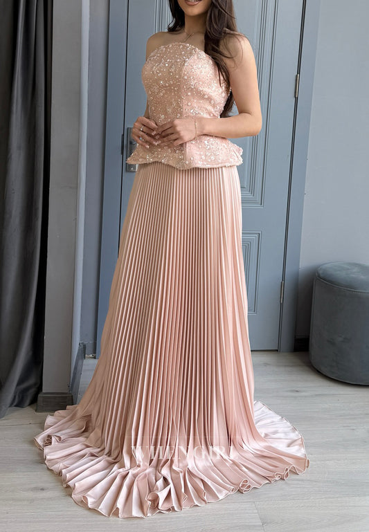 Soft Blush Side Slit Pleated Beaded Sleeveless Tube Top Sheath Sweep Train Formal Dress Evening Dress