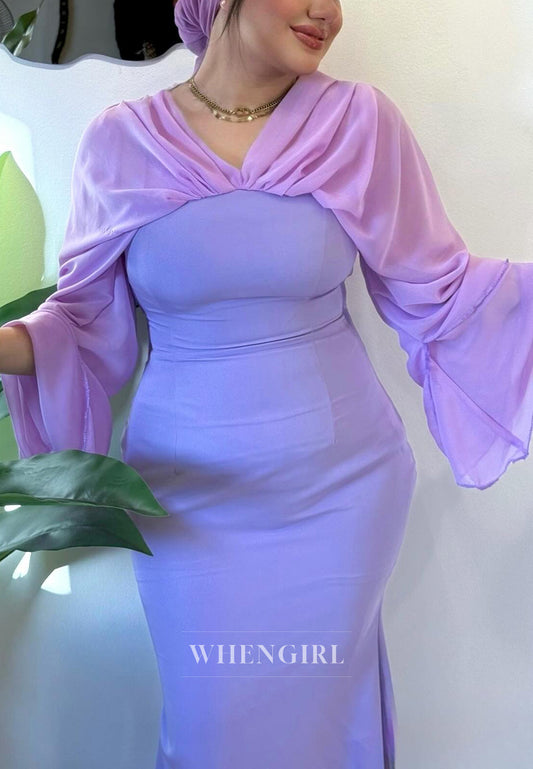 Lilac V Neck Long Sleeves Sheath Sweep Train Evening Dress Formal Gown