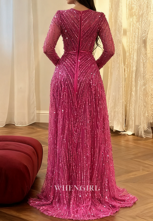 Fuchsia V Neck Long Sleeves Beaded Sheath Evening Formal Dress