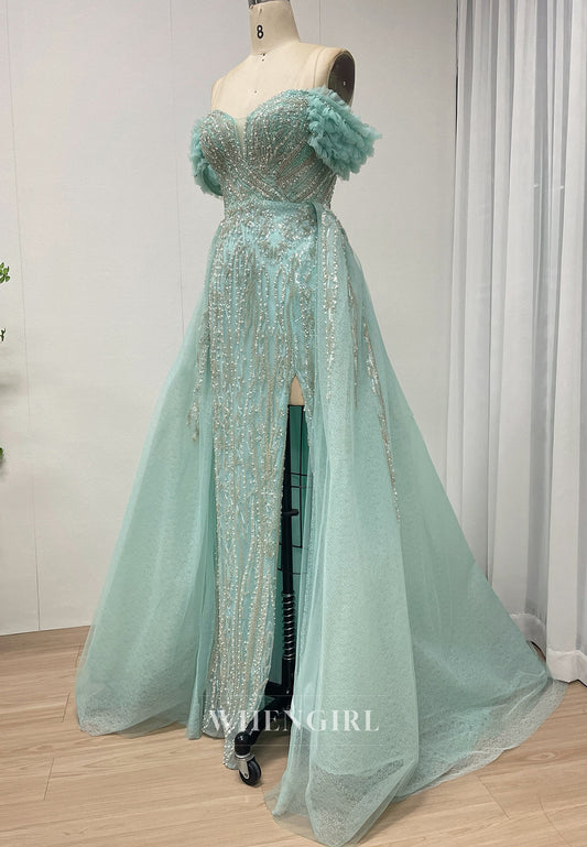 Turquoise Sheath Off Shoulder Beaded Side Slit V Neck Evening Formal Dress with Train