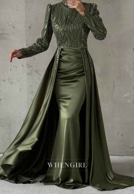 Sheath High Neck Beaded Long Sleeves Pleated Side Train Evening Formal Dress