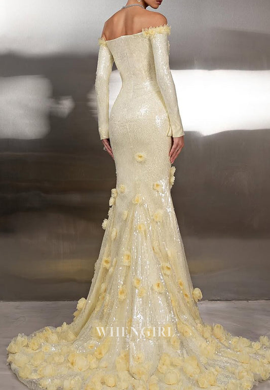 Mermaid Off Shoulder Long Sleeves Beaded Long Floor Length Evening Formal Dress