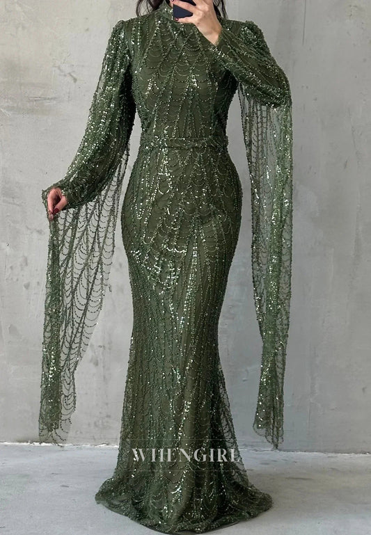 Column High Neck Long Sleeves Beaded Pleated Floor Length Evening Formal Dress