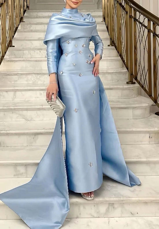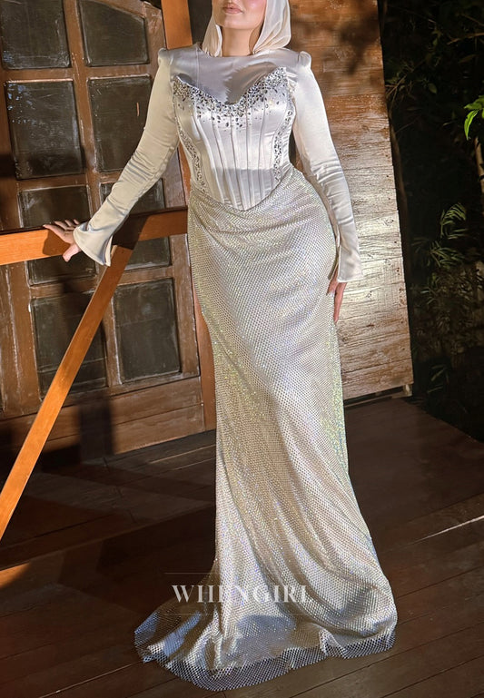 High Neck Long Sleeves Side Train Crystal Beaded Column Long Formal Dress Evening Gown