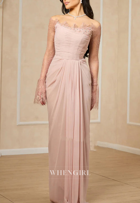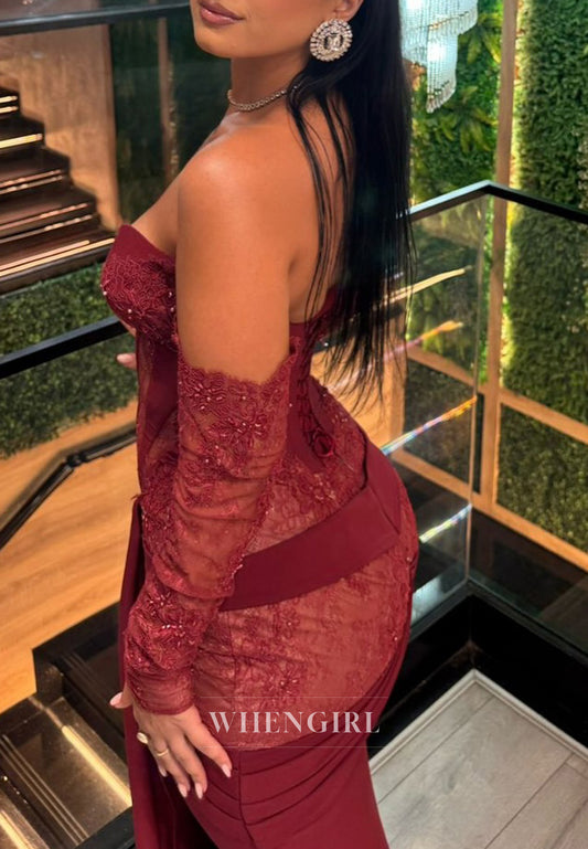 Chocolate Pleated Side Slit Off Shoulder Lace Long Sleeves Mermaid Sweep Train Formal Evening Dress