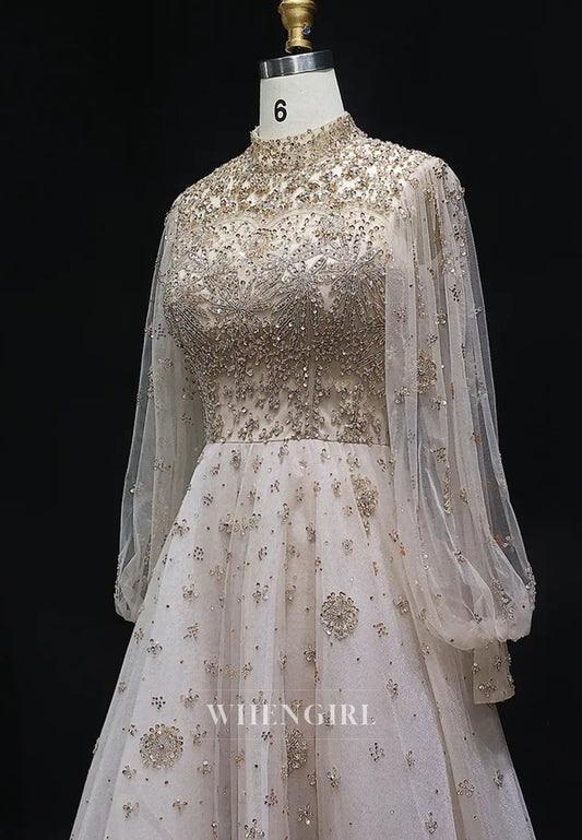 Champagne High Neck Long Sleeves Beaded A-Line Evening Formal Dress