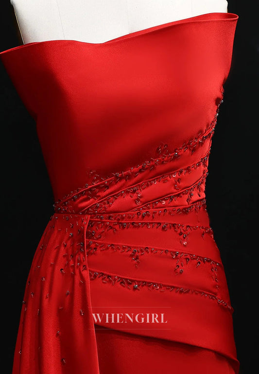 Red Sheath Strapless Pleated Beaded Sleeveless Side Train Evening Formal Dress