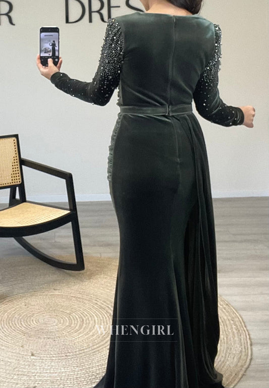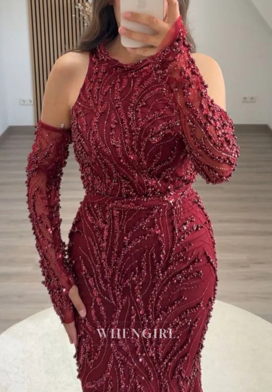 Asymmetrical Neck Side Slit Mermaid Beaded Long Sleeve Formal Gowns