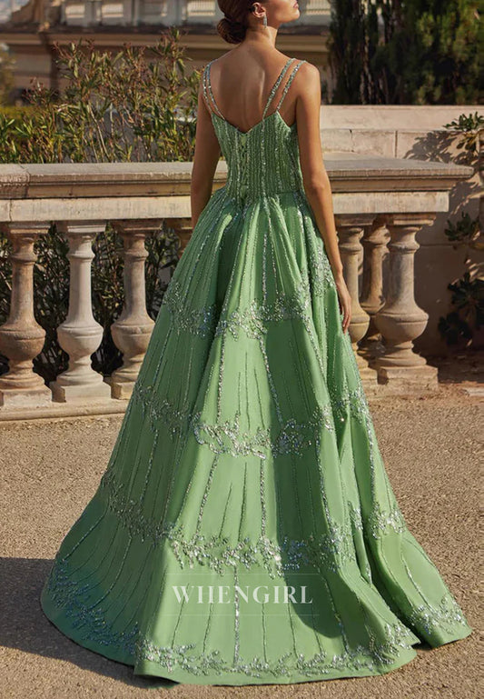 Green V Neck Sleeveless Beaded Lace Up A-Line Evening Formal Dress