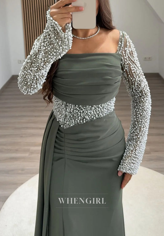 Square Neck Sheath Long Sleeves Pleated Beaded Evening Formal Dress