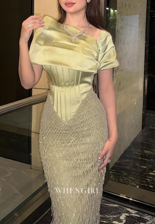 Dusty Sage Asymmetrical Neck Pleated Beaded Sheath Formal Evening Gown