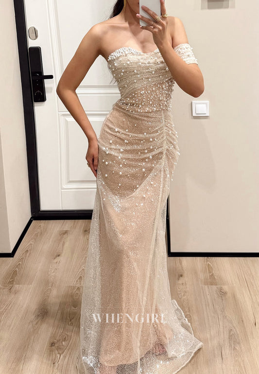 Gold Sweetheart Sleeveless Side Slit Beaded Sweep Train Evening Formal Dress