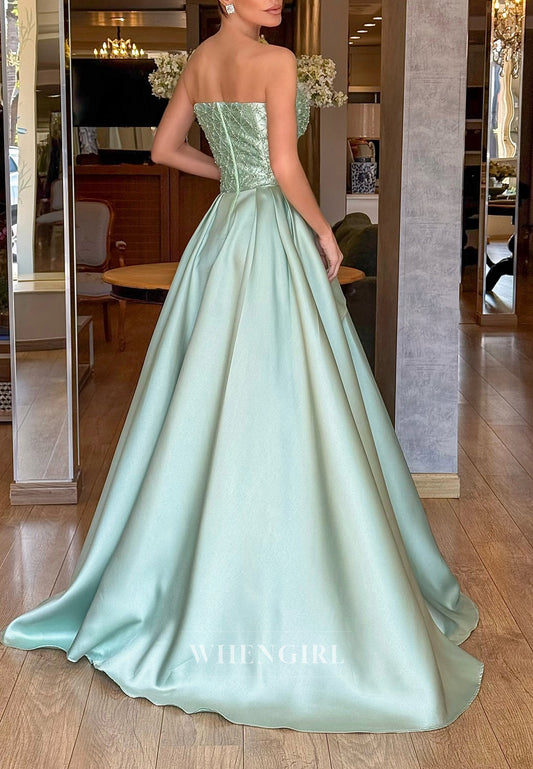 Turquoise Tube Top Beaded Sleeveless Back Zipper Satin A-Line Evening Formal Dress