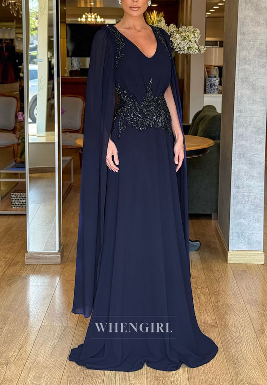 Navy A-Line V Neck Chiffon Long Sleeves Appliqued Formal Dress Evening Gown