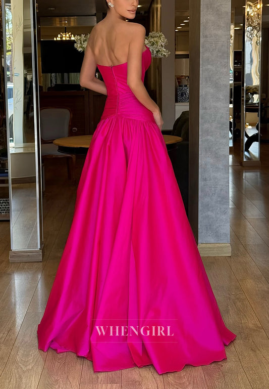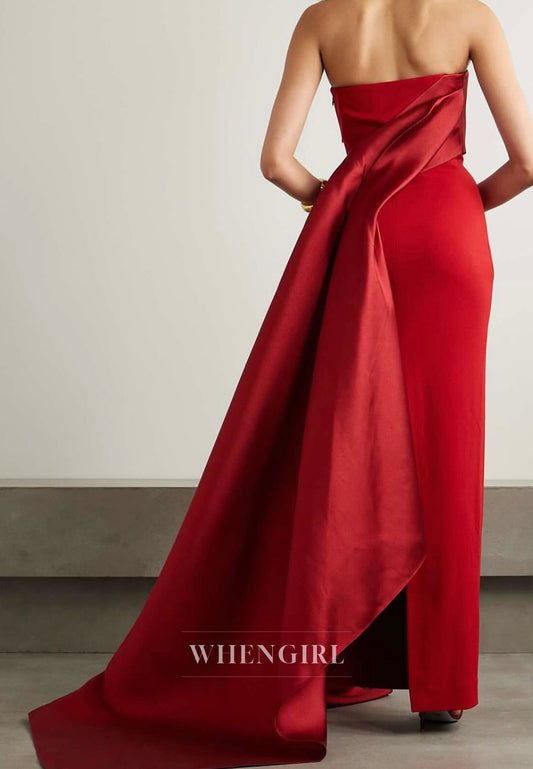 Red Tube Top Sleeveless Pleated Sheath Long Evening Dress with Side Train