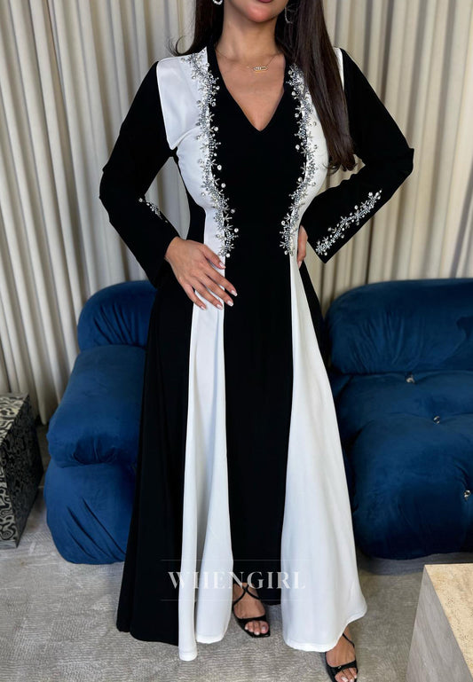 Black and White V Neck Beaded Long Sleeves A-Line Evening Gown