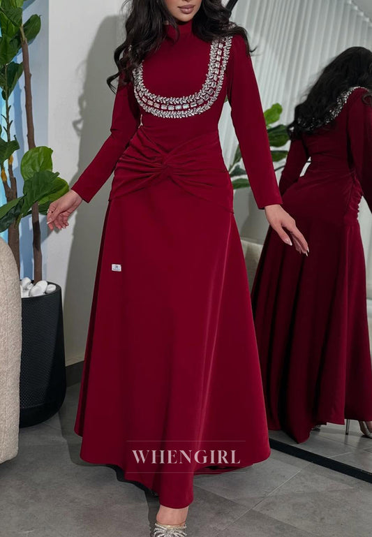 Burgundy Rhinestones Beading Long Sleeves Pleated Back Zipper High Neck A-Line Evening Gown