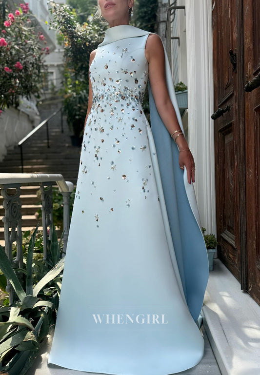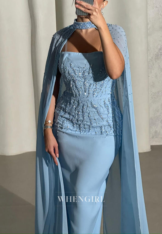 Blue Sheath Sleeveless Beaded Back Zipper Formal Evening Dress with Cape