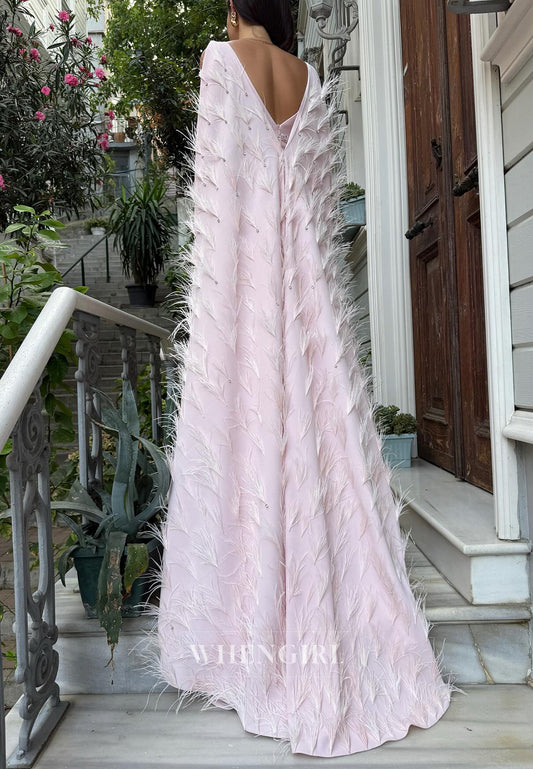 Pale Blush Regular Straps Scoop Neck Beaded Feather Sweep Train Sheath Evening Gown
