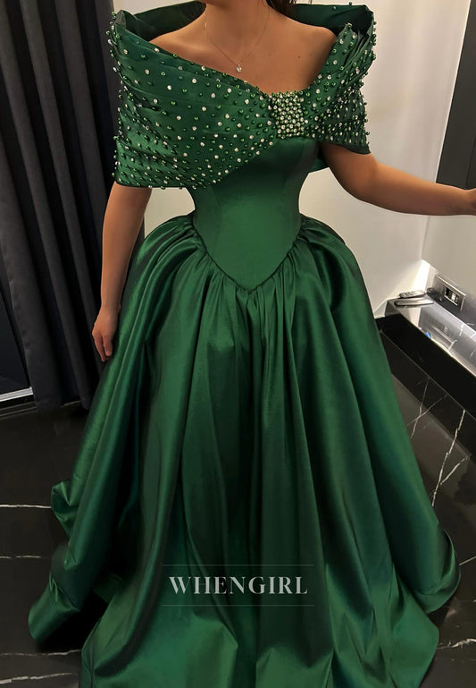 Green Beaded Off Shoulder Ball Gown Short Sleeves Evening Dress Party Gown