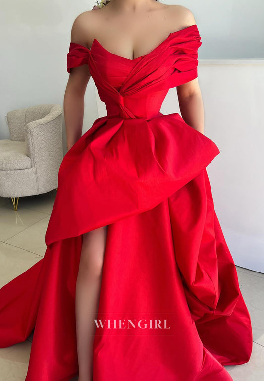 Red Off Shoulder Pleated Ball Gown Sleeveless Sweep Train Evening Gown