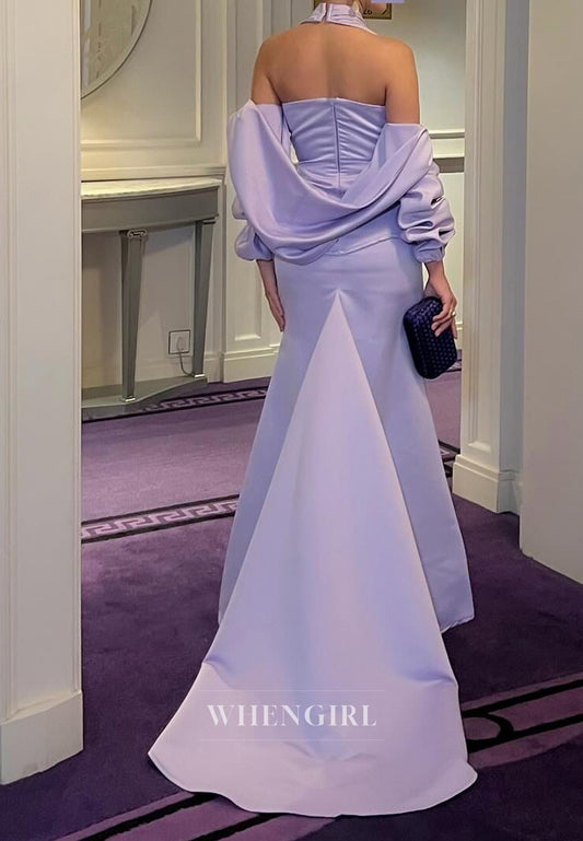 Violet 3/4 Sleeves Halter Back Zipper Sweep Train Mermaid Formal Evening Dress